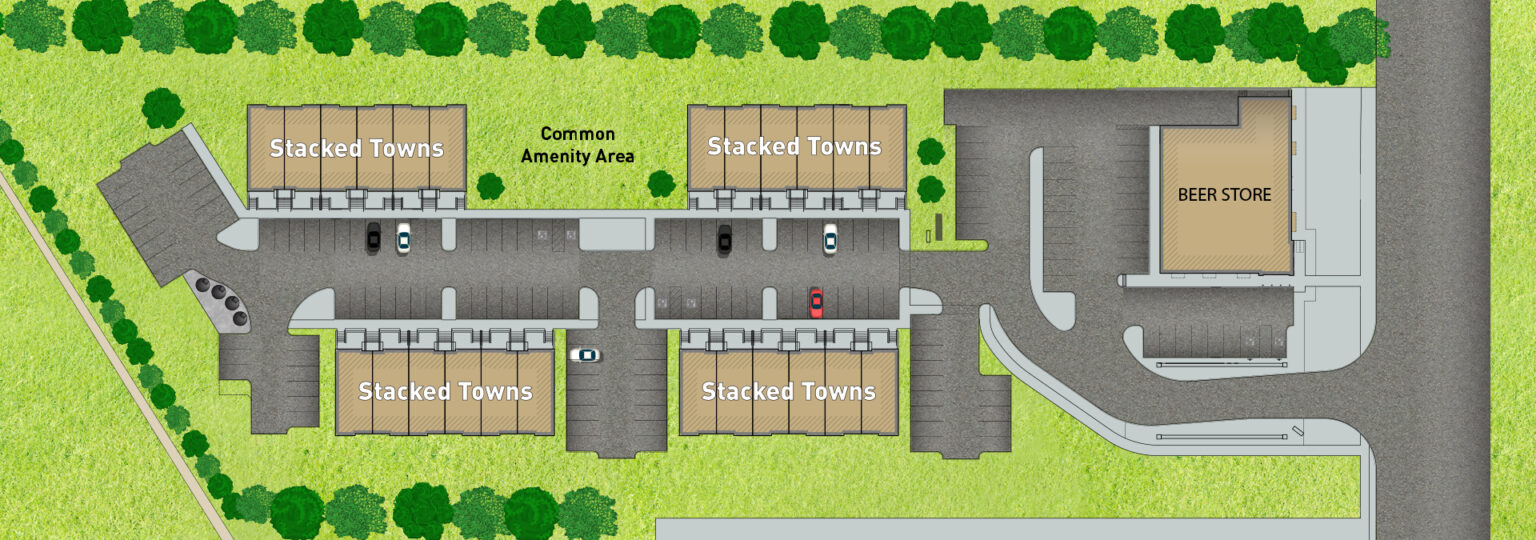 This development will comprise a proposed 96 upscale stacked townhomes across 4 buildings at the rear of the property, and a new format Beer Store at the front of the property.